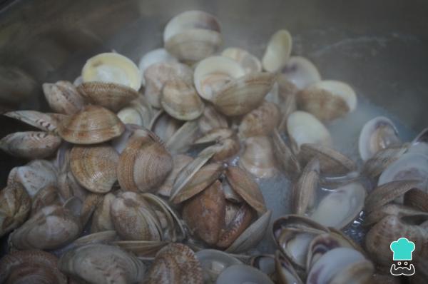 6Agrega el vaso de vino blanco, remueve y, cuando empiece a hervir, añade las almejas. Vierte también el agua con el que las has cocinado con la ayuda de un colador.