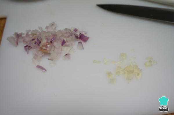 3 Por otro lado, pica la cebolla en trozos muy pequeñitos, junto con el ajo.