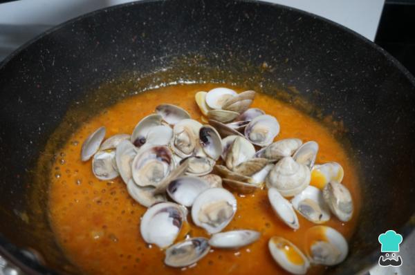6 Agrega el vaso de vino blanco, remueve y, cuando empiece a hervir, añade las almejas. Vierte también el agua con el que las has cocinado con la ayuda de un colador.