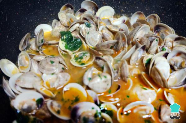 7Por último, deja cocinar las almejas en salsa durante unos minutos, prueba que tengan suficiente sal y añade perejil picado.