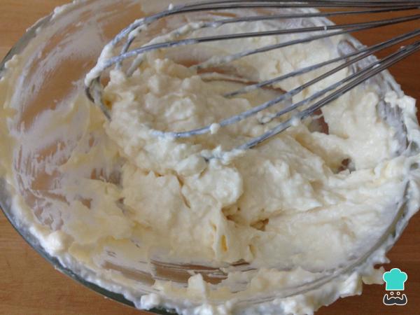 7Mientras tanto, preparamos el glaseado: mezclamos el queso de untar con la mantequilla, la esencia de vainilla y el azúcar glas.