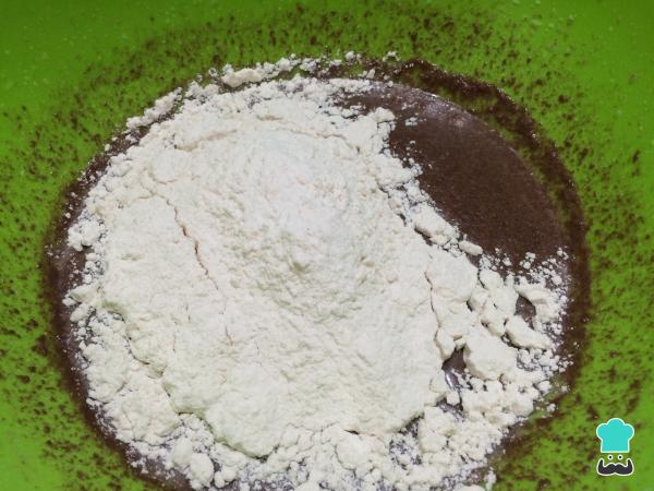 4 Mezclar el polvo de hornear con la harina y añadirla al batido de a poco, mezclar todo muy bien hasta obtener una consistencia homogénea.