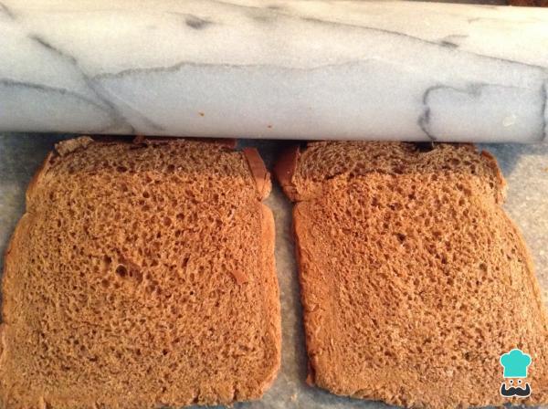 2 Debes poner una rebanada de pan de molde sobre la mesa de trabajo y con la ayuda de un rodillo aplastarla muy bien hasta dejarla muy fina.