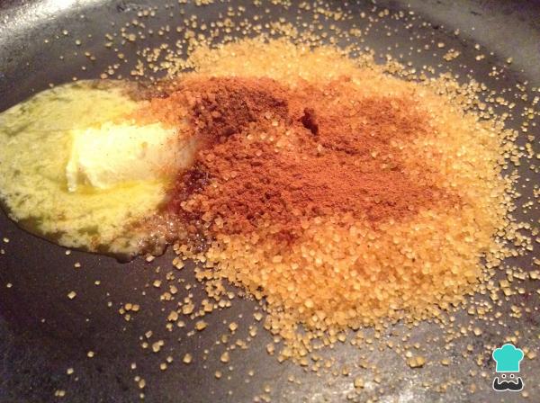 7 Lleva una sartén a fuego medio, adiciona la mantequilla, agrega también la mezcla de canela y azúcar para seguir con la preparación de los canutillos de torrijas.