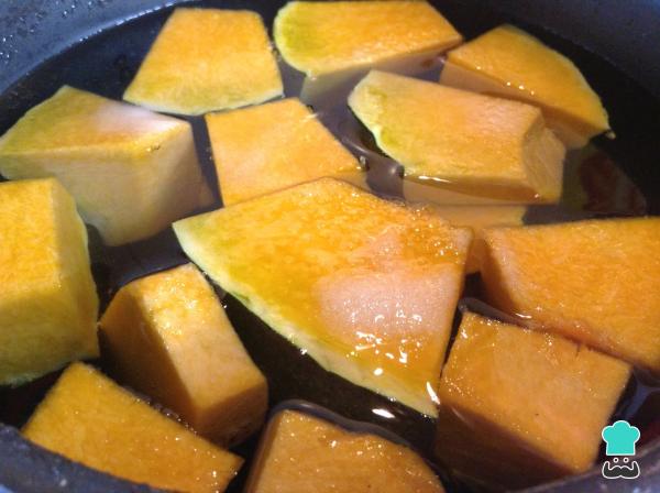 2Corta en cuadros medianos la calabaza y llévala a una olla con suficiente agua como para cubrirla por completo. Añade una pizca de sal y cocina a fuego medio hasta que esté blanda.