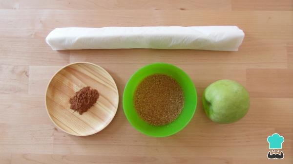 1Para preparar estas exquisitas empanadas de manzana y canela, empezaremos por reunir los ingredientes. Las cantidades indicadas de los ingredientes sirven para 4 hojas grandes de hojaldre, pero puedes hacer más empanadas rellenas si las cortas más pequeñas.