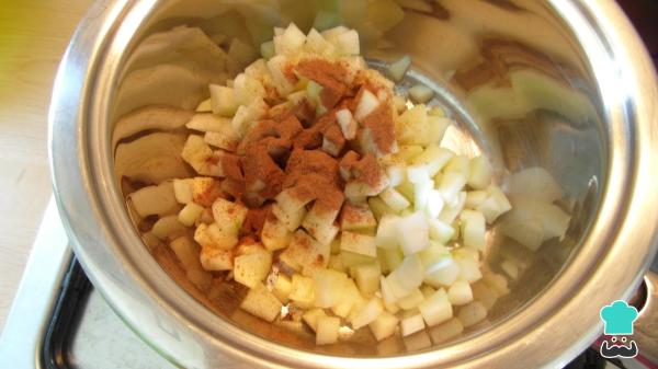 2 Para empezar la preparación de las empanadillas rellenas de manzana y canela, primero hay que lavar, pelar y cortar las manzanas en cubos pequeños. Luego cocínalas a fuego medio-bajo junto con la canela y el azúcar en una olla.