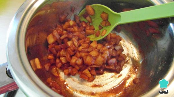 3 Cocina el relleno de las empanadas de manzana fáciles hasta que se convierta en una especie de mermelada espesa, lo cual tardará unos 5 minutos aproximadamente.