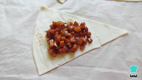 4Corta la masa de hojaldre con el formato que prefieras y en número par para que puedas cerrar todas las empanadas de manzana y canela. A continuación, coloca un poco del relleno en el centro pero no mucho, para que después las empanadas rellenas se puedan cerrar bien.