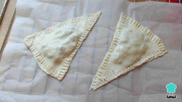 5 Cubre el relleno con otro trozo de masa de hojaldre, presiona los bordes con un tenedor para que las empanadillas rellenas de manzana y canela se cierren bien y píntalas por encima con un poco de mantequilla derretida. Con el horno precalentado a 180 ºC, hornea las empanadas de hojaldre durante unos 15 minutos, o hasta que estén doradas.