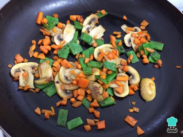 3En una sartén con aceite de oliva saltear la zanahoria cortada finamente, los guisantes cortados en trozos pequeños y los champiñones en láminas, salpimentar.