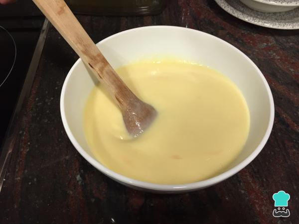 3En un bol parte echaremos los huevos y los batiremos. Luego los juntaremos con la mezcla del cazo y removemos para que se mezcle bien todo.