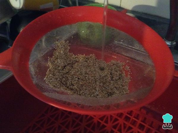 2Primero debes lavar muy bien la quinoa. Para ello, debes llevar la quinoa a un colador y enjuagar con abundante agua hasta que veas que esta sale transparente.
