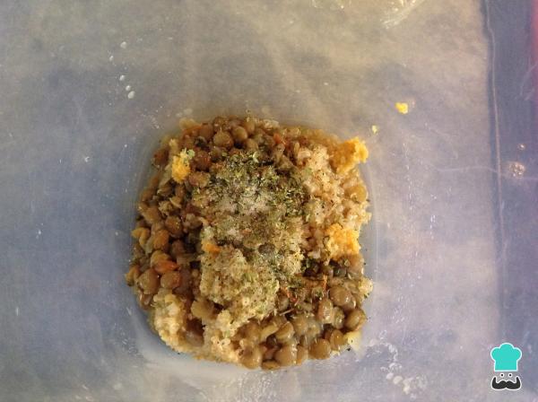 4 Para continuar con la preparación de las hamburguesas vegetarianas, en un bol mezcla las lentejas con la quinoa, el orégano, la pasta de ajo al gusto, sal y pimienta.