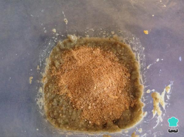 5 Ahora agrégale la miga de pan y mezcla con la ayuda de una cuchara. Esto ayudará a que nuestra mezcla tenga más consistencia y cuerpo al momento de la preparación.