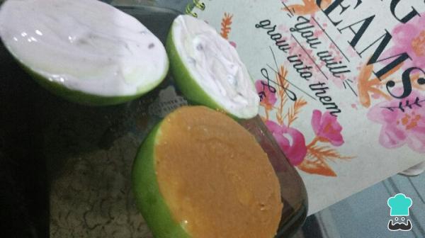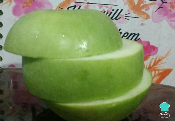 2 Cuando hayas decido lo de los ingredientes, entonces pasamos al segundo paso que es partir la manzana en tres como se muestra en la imagen.