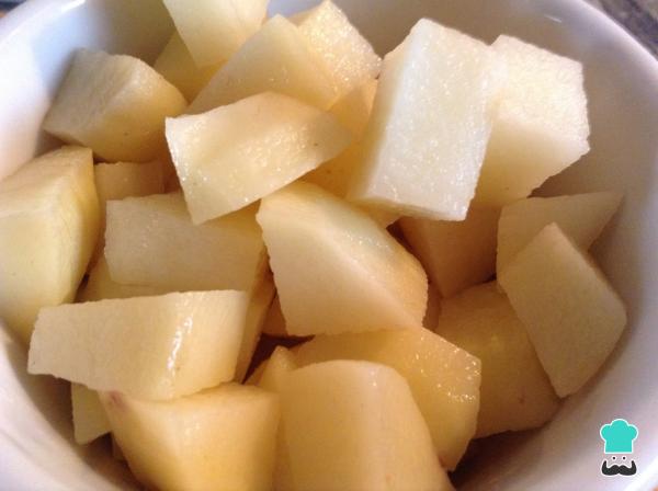 2 Para cocer las patatas podemos hacerlo de dos maneras. La primera de ellas y más popular para la preparación de las papas aliñás es cocerlas enteras, sin pelar, y cubiertas de agua con una cucharada de sal gruesa. La segunda, más sencilla y también válida, es pelando las patatas y cortándolas en cuadros medianos. Nosotros lo haremos de esta forma.