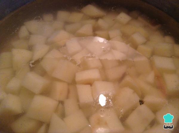2Para cocer las patatas podemos hacerlo de dos maneras. La primera de ellas y más popular para la preparación de las papas aliñás es cocerlas enteras, sin pelar, y cubiertas de agua con una cucharada de sal gruesa. La segunda, más sencilla y también válida, es pelando las patatas y cortándolas en cuadros medianos. Nosotros lo haremos de esta forma.