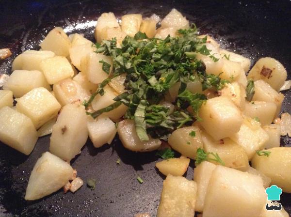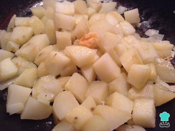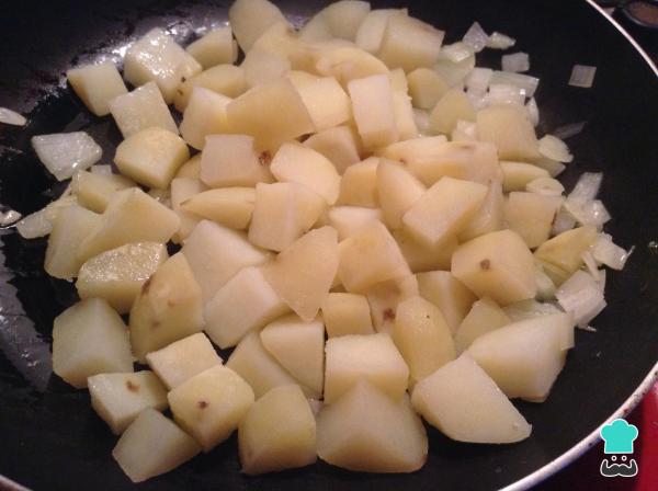 5 Si queremos obtener unas patatas con un toque crocante, añádelas a la sartén donde tenemos la cebolla y dóralas. La receta tradicional no realiza este paso, por lo que es totalmente opcional.