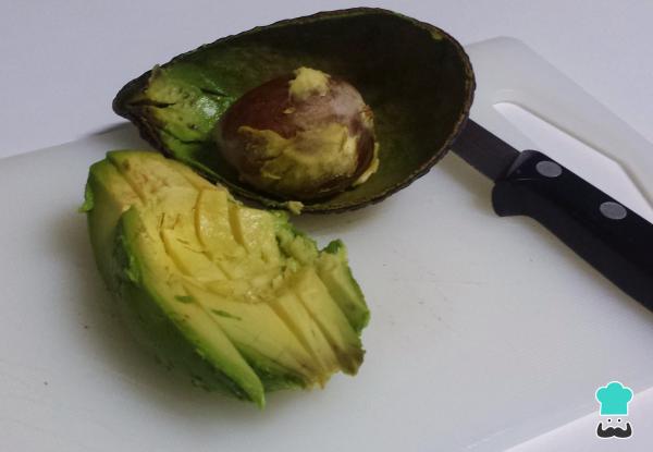 2El aguacate no puede faltar, es un super alimento que nos aporta vitaminas, Omega 3, magnesio y potasio entre otros. Entonces, corta el aguacate en laminas finas, como se ve en la foto, aunque si prefieres también puedes hacer una pasta siguiendo la receta del guacamole tradicional.